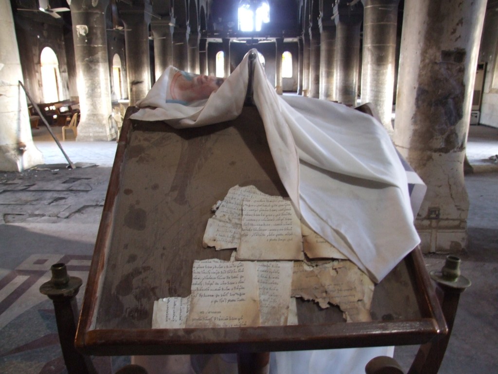 Pátio interior da Catedral da Imaculada Conceição, em Qaraqosh, utilizado pelo Estado Islâmico para campo de tiro. Foto: jmr