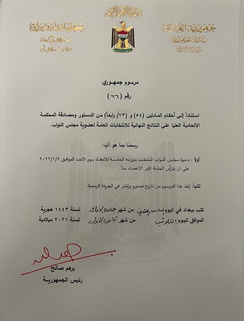 Domingo, 9 de Janeiro, o Parlamento do Iraque que resulta das eleições de 10 de Outubro reúne-se pela primeira vez. O bloco sunita vai indicar Mohammed al-Halbousi para mais um mandato como presidente do parlamento. Se o acordo em vigor for respeitado – Presidente da República curdo, Primeiro-ministro xiita e presidente do parlamento sunita – Halbousi será eleito, mas nada está garantido tendo em conta a complexa situação política. De seguida, o Presidente da República também terá de ser eleito para então nomear um Primeiro-ministro do partido mais representado (o bloco xiita de Moqtada Al Sadr), que terá de formar um governo no prazo de 30 dias.