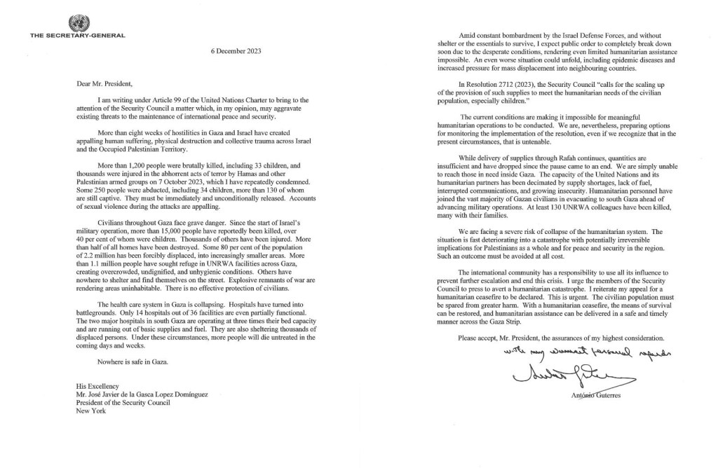 Ao escrever esta carta, inédita, ao Presidente do Conselho de Segurança da ONU, António Guterres, invoca pela primeira vez o artigo 99 da Carta das Nações Unidas (Artigo 99: O Secretário-Geral poderá chamar a atenção do Conselho de Segurança para qualquer assunto que em sua opinião possa ameaçar a manutenção da paz e da segurança internacionais) e confronta o Conselho de Segurança com uma responsabilidade que só ao Conselho de Segurança pertence: a necessidade urgente de decisões que terminem com o massacre em Gaza.