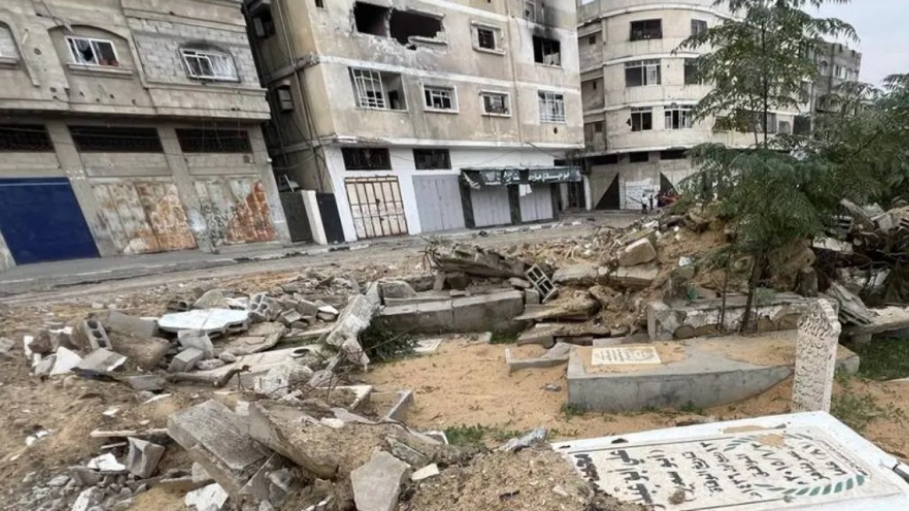 A Faixa de Gaza está transformada num monte de ruínas onde também há mesquitas e igrejas. Os cemitérios da Faixa de Gaza também não escapam. Os bombardeamentos e os carros blindados israelitas desfazem os locais onde os mortos da Faixa de Gaza poderiam descansar em paz. Não podem. As sepulturas são destruídas pelas bombas e pelas lagartas dos blindados. É como se os mortos de Gaza morressem uma segunda vez. As famílias fazem um segundo luto.