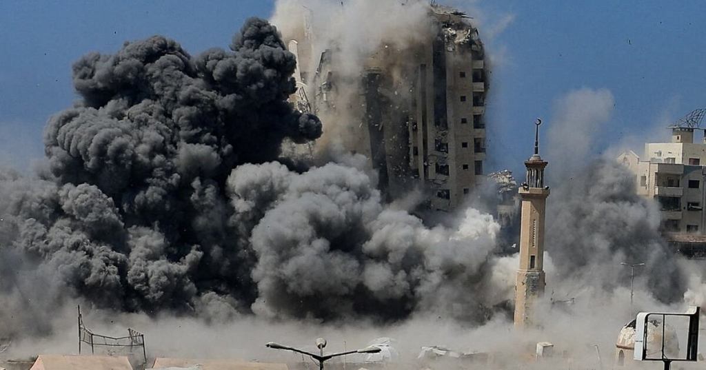 A concretização deste objectivo – a demolição – foi desencadeada há alguns dias com uma ofensiva terrestre nas entradas da cidade e tem hoje um sinal maior com o bombardeamento de uma torre de habitação de 14 andares (a torre Mushtaha) que se desfez como um castelo de cartas.