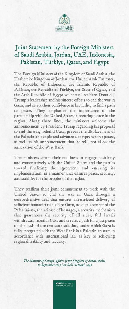 De um modo geral as reacções a nível global foram de aceitação do plano Trump. Os ministros dos negócios estrangeiros do Egipto, Indonésia, Jordânia, Paquistão, Qatar, Arábia Saudita Turquia e Emirados Árabes Unidos, assinam um comunicado em que saúdam o plano e consideram-no um esforço sincero para acabar com a guerra em Gaza e afirmam confiança na possibilidade de encontrar um caminho para a paz”.