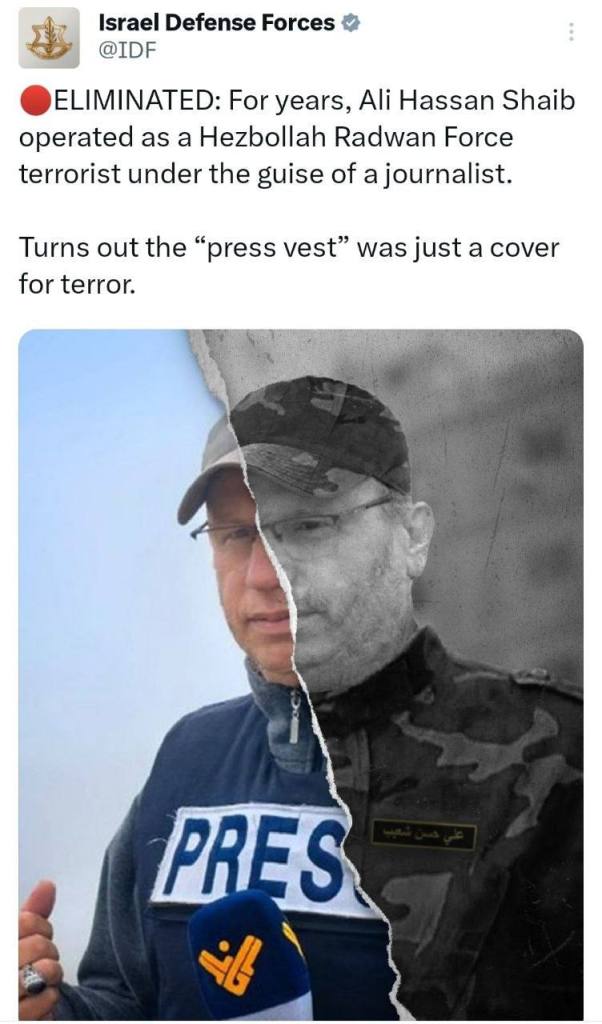 Israel, sem fornecer qualquer prova, justificou a morte do jornalista qualificando-o de terrorista da unidade de informação da Força Al Radwan, a unidade de élite do Hezbollah, dizendo que Ali Shouaib utilizava o disfarçe de jornalista mas trabalhava para o terrorismo. Em simultâneo, o exército israelita publicou na rede X uma imagem de Ali Shouabi dividida a meio, com uma metada em que o jornalista tem o colete “Press” e a outra metade, numa versão modificada artificalmente, com o mesmo jornalista vestindo um uniforme do Hezbollah. Na legenda podia ler-se: “o colete de imprensa não é mais do que uma cobertura para o terrorismo”.
